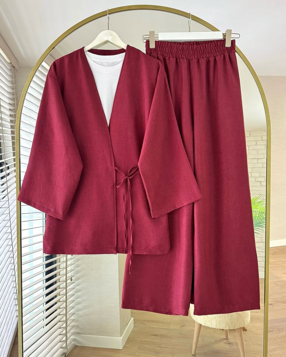 Bağlamalı Keten Kimono Takım Bordo