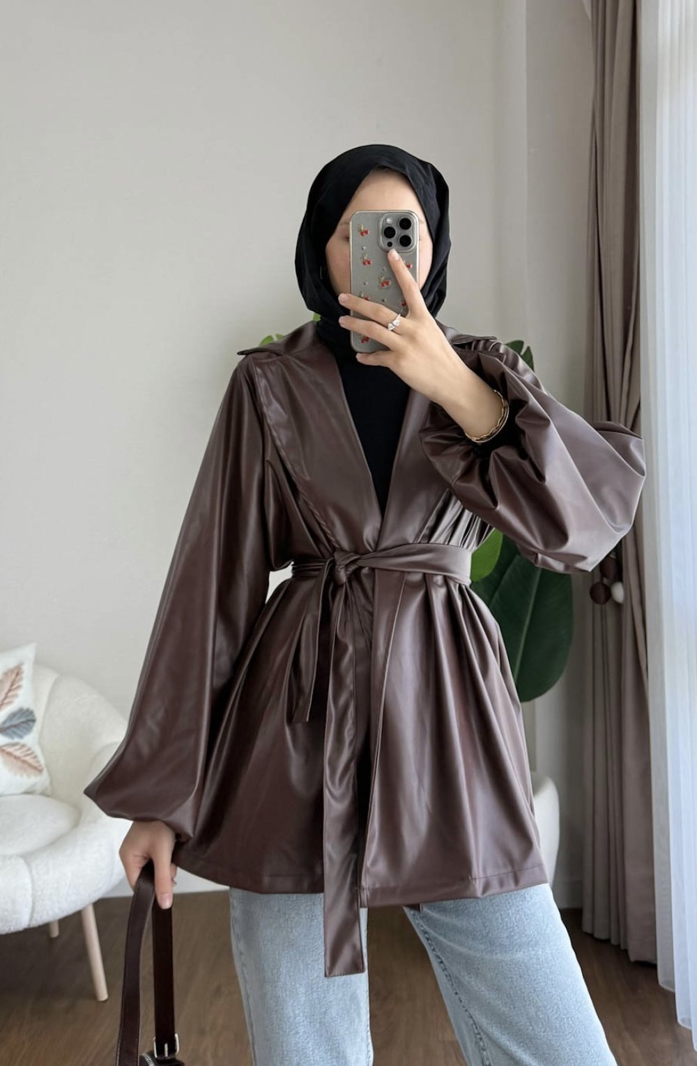 Balon Kol Beli Kuşaklı Deri Trenç