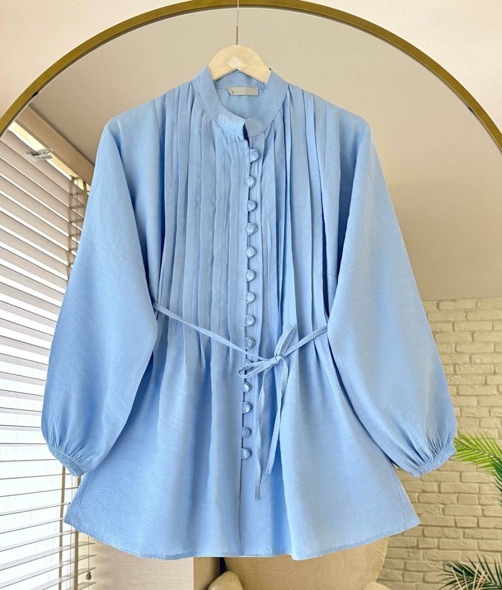 Brit Düğmeli Nervürlü Gömlek Mavi